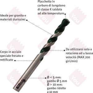 Le punte per Granito (articolo 82G) sono realizzate a partire da una barra di acciaio speciale, con corpo fresato dal pieno e rettificato, su cui viene poi montato, con le migliori tecniche di saldatura, un inserto in Carburo di Tungsteno. Le Punte per Granito sono utensili superprofessionali per la foratura del granito e dei materiali duri. Sono dotate di placchetta in Metallo Duro (Carburo di Tungsteno) di classe K, e presentano affilatura destra con forte scarico, da utilizzarsi a rotazione e a bassa velocità (max. 200 giri/min).