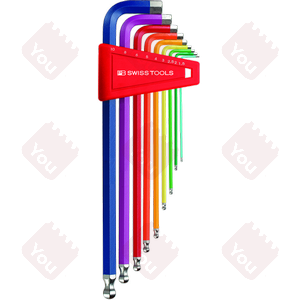 Serie chiavi a brugola colorate; ad ogni misura corrisponde un determinato colore. In cromo vanadio, durezza 58-59 Rockwell. Misure: mm 1,5 - 2 - 2,5 - 3 - 4 - 5 - 6 - 8 - 10